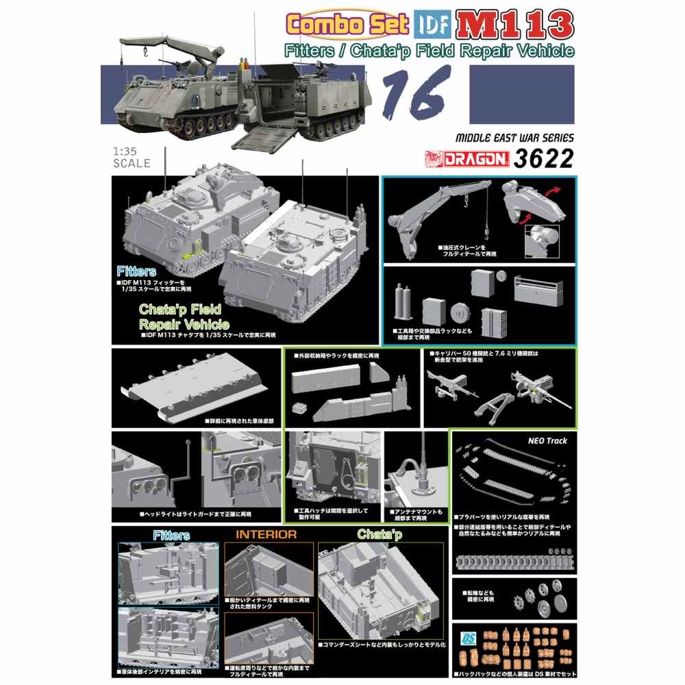 このキットではイスラエル国防軍が配備、運用する工兵車両、M113フィッターとチャタプを再現する1/35スケールのプラスチックモデル組み立てキットです。どちらの車輛も作れる2輛分のパーツが入ったコンボセットです。