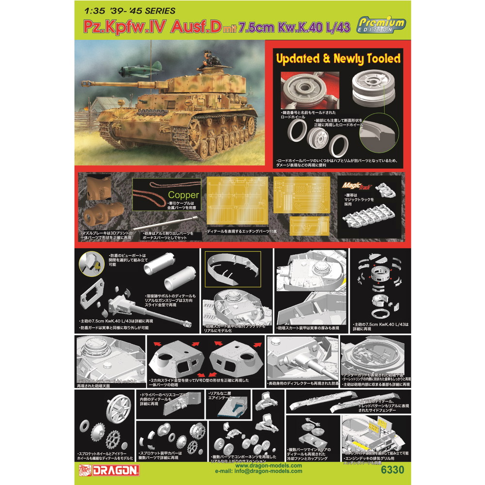 長砲身の主砲を装備した力強い姿をリアルに表現。もちろんIV号戦車D型ならではのサスペンション、エンジンデッキやキューポラなど、細部のディテールもシャープなパーツ再現でモデル化しています。