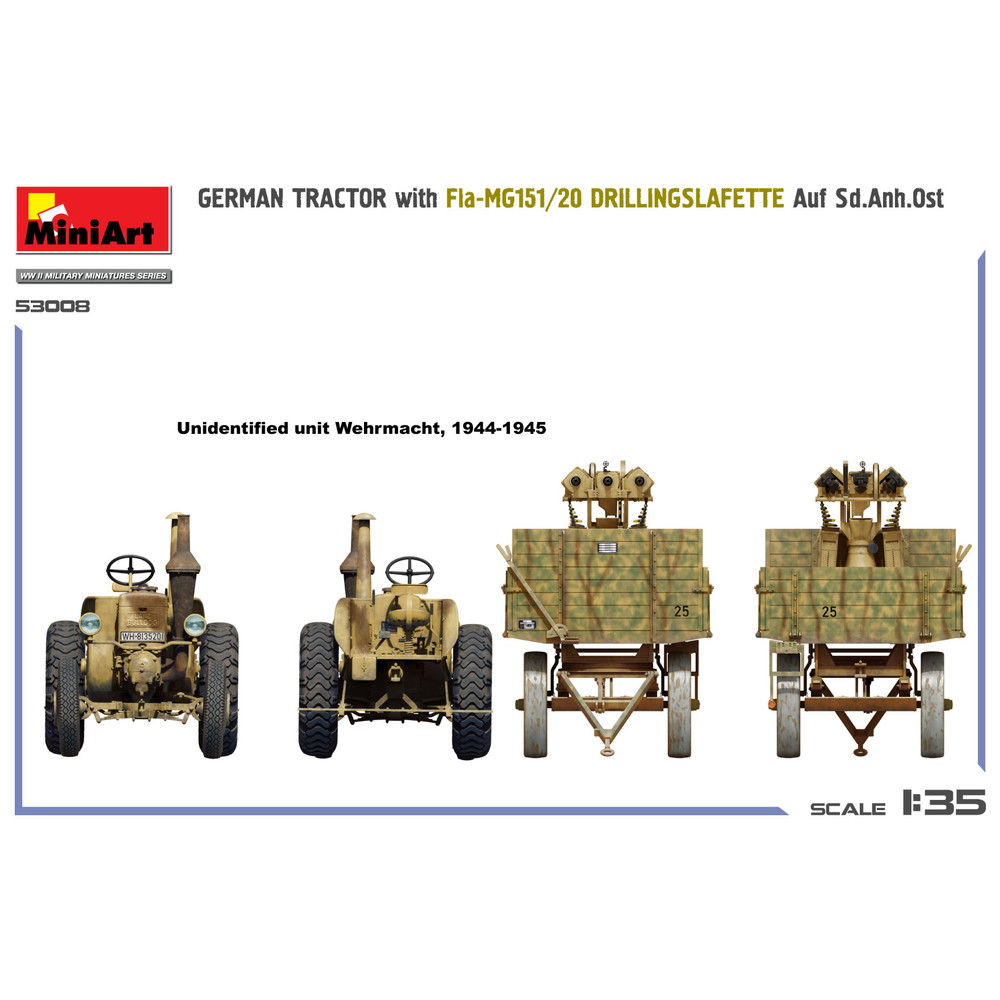 モデルは2cm 3連装対空機関砲 MG151/20ドリリング1基を搭載した1.5t貨物トレーラー、ゾンダーアンハンガー・オストとそれを牽引するトラクターを1/35スケールで再現したプラスチックモデル組み立てキットです。