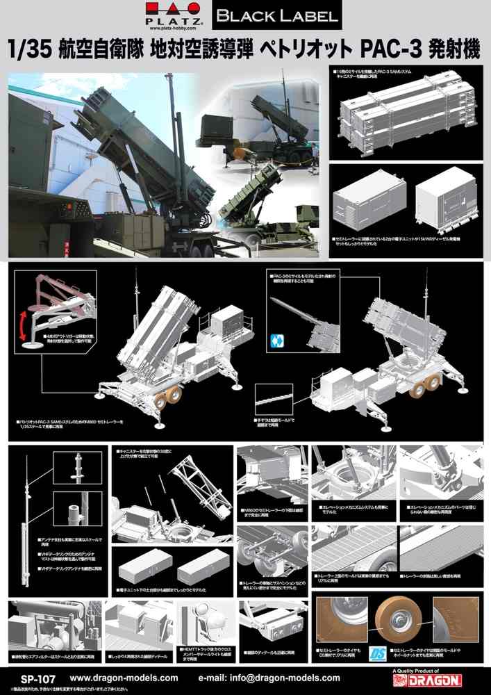 航空自衛隊で運用されている、地対空誘導弾ペトリオットPAC-3を1/35スケールで再現。PAC-3キャニスター、それをM860セミトレーラーに搭載したM901発射機をモデル化しています。