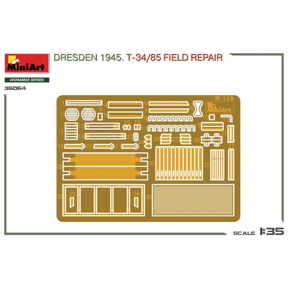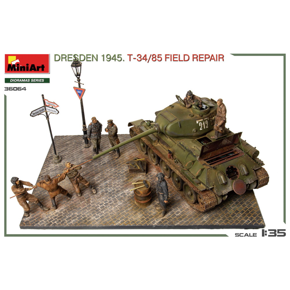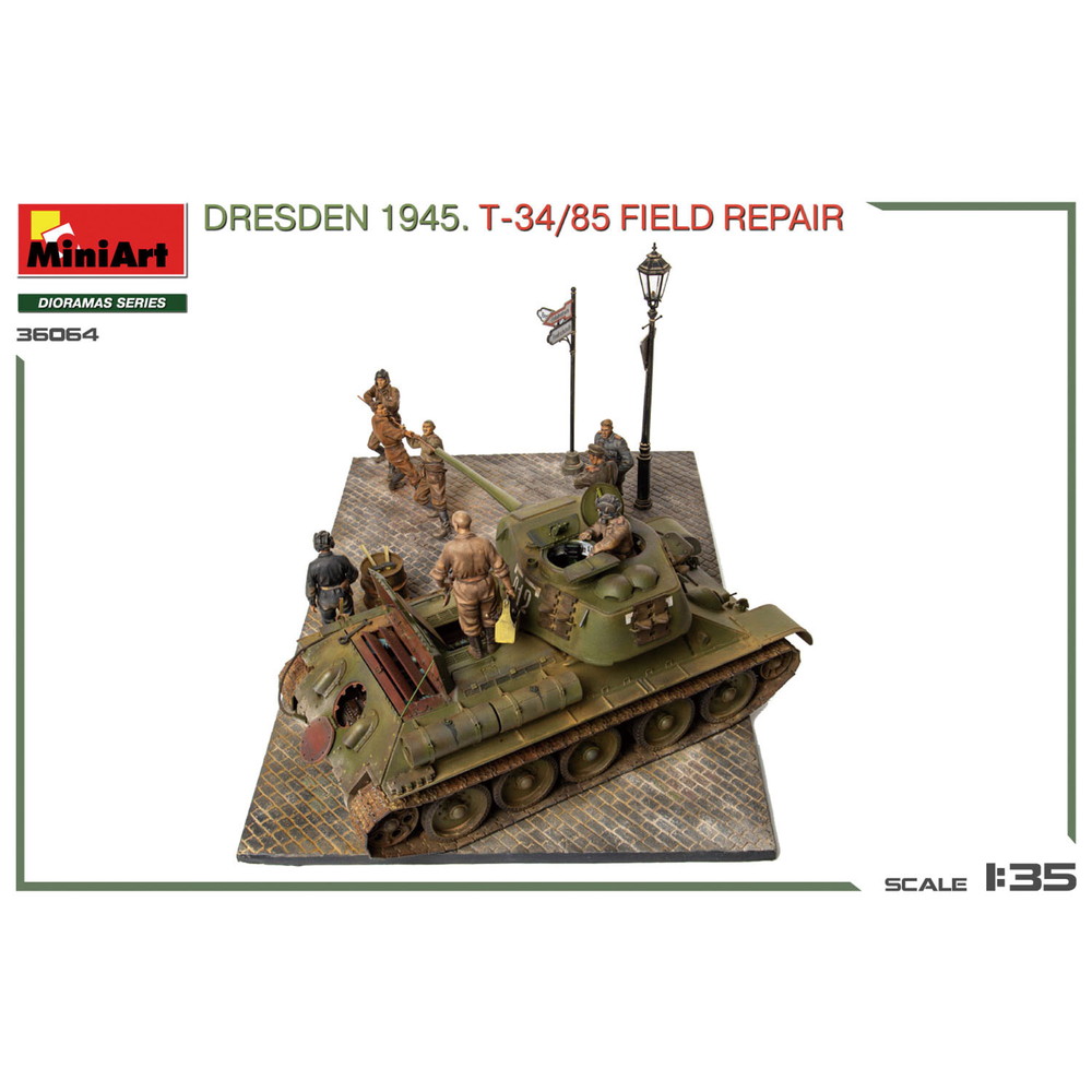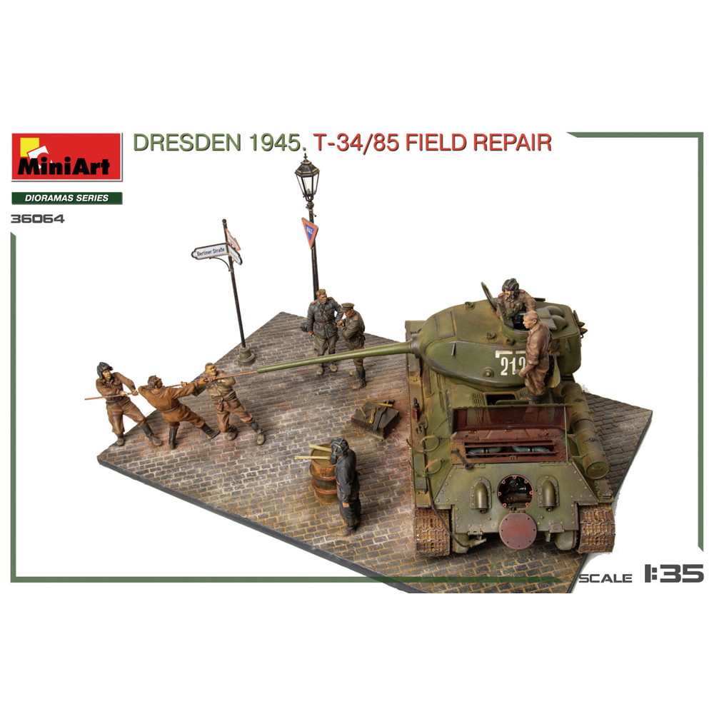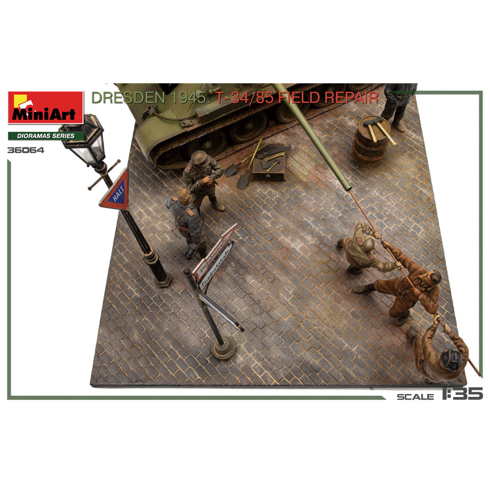 1945年、ドレスデンに侵攻したソビエト軍がその戦いの中で運用してきたT-34/85を街の路上で整備・修理をする様子を再現する情景セットです。