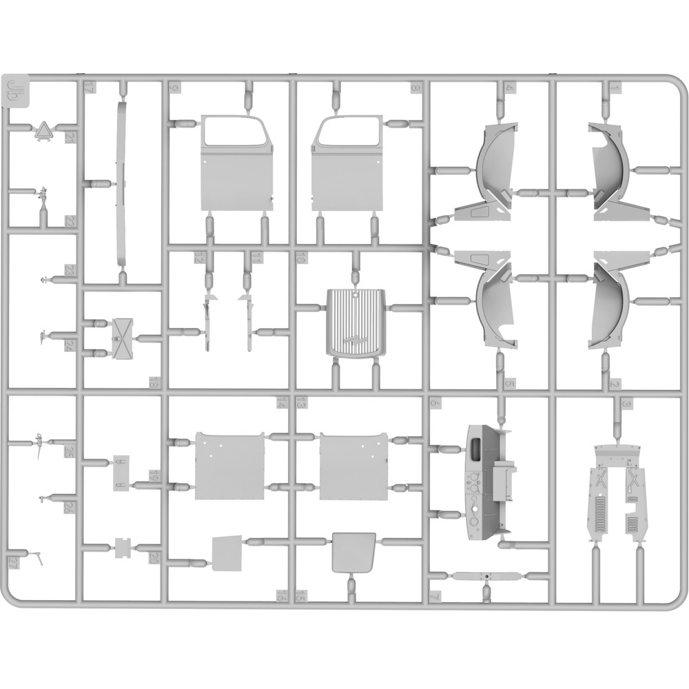 エンジンからフレームまで詳細に再現されたフルディテールキットです。ラダーフレームのシャーシにはリーフスプリングのサスペンションやドライブシャフト、スペアタイヤや燃料タンクなどをしっかりと再現。