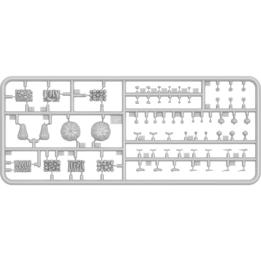 加えて鍋や炊事道具、かぼちゃや人参、ナスなどの食材の野菜類も用意。セットには調理するコックの兵士2体と薪を割る兵士、鳥を抱える兵士の4体もセットされ、そのまま戦場の炊事風景が再現できます。
