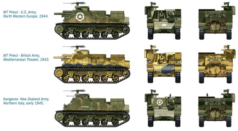 モデルはアメリカ陸軍が開発した105㎜自走榴弾砲M7プリーストの初期生産型を再現したプラスチックモデル組み立てキットです。スケールは1/72、仕上がりの全長は8.3㎝。キットは2輌分のパーツがセットされています。オープントップ車両ならではの戦闘室の再現も魅力です。M7プリーストにも、それをベースにしたカンガルー装甲兵員輸送車にもどちらか選んで組み立て可能。2輌分のパーツが入っていますから作り揃えてみるのも良いでしょう。車体下部は一体成型。足回りのパーツも履帯とホイール、サスペンションなどが一体となったパーツ構成で、組み立ては手軽。ビギナーの方にも安心して取り組んでいただけます。戦車兵のフィギュア1体付。また、マーキングは1944年のヨーロッパにおけるアメリカ軍のM7プリースト、1943年のヨーロッパにおけるイギリス軍のプリースト、さらに、1945年の北イタリアにおけるニュージーランド軍のカンガルー用の3種類のマーキングを用意しています。