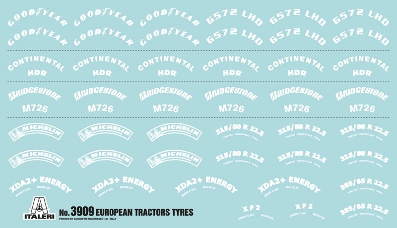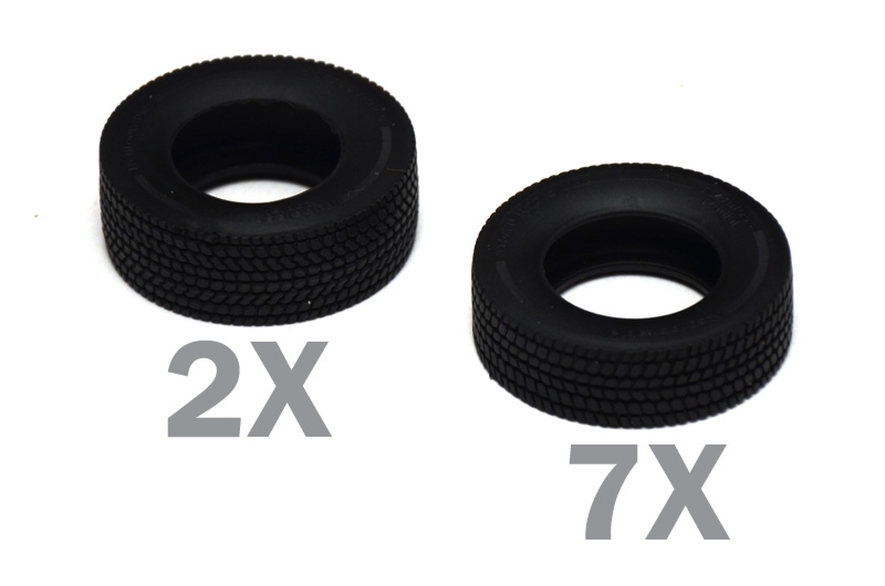 このセットでは1/24スケールのトラックモデルやトレーラーヘッドのモデルに使えるパーツを用意しています。タイヤとホイールリムをセット。タイヤは385/65サイズのタイヤが2本と315/80サイズのタイヤが7本入っています。ホイールリム部品はフロント用がタイヤサイズに合わせて2種類、リヤ用はダブルタイヤのアウト用が2セットとインサイド用が2セット、用意され、さらに、スペアホイールリムも1セット用意されています。実感あふれるトレッドパターンやホイールの立体感があなたのトラックモデルの実感を高めてくれることでしょう。さらに、このセットではタイヤのサイドウォール用デカールを用意。グッドイヤー、コンチネンタル、ブリヂストン、ミシュランなどのロゴマークをセット。お好きなメーカータイヤに仕上げていただけます。