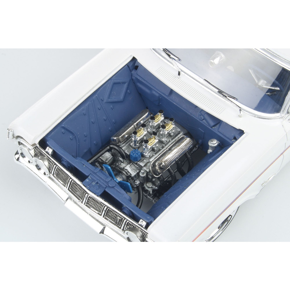 また、シャーシ下面のサスペンションなども詳細に再現され、走りのパフォーマンスを伝えます。ボディは2ドアハードトップ。丸目4灯のヘッドライトを装備したフロントグリルなどのデザインを正確に表現。
