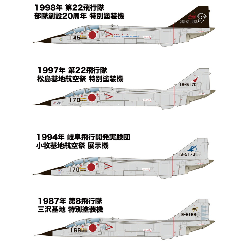 もちろん、機体外観だけでなく。複座のコクピット内部や脚パーツなどに至るまで細部のディテールも繊細にモデル化して仕上がりの実感を引き締めます。注目のマーキングは第22飛行隊が1998年に部隊創設20周年を記念して制作した特別塗装機、1997年の松島基地航空祭で披露された第22飛行隊の特別塗装機、そして、1994年の小牧基地航空祭で披露された岐阜飛行開発実験団展示機、さらに1987年に三沢地の第3航空団第8飛行隊のマーキングをセレクト。