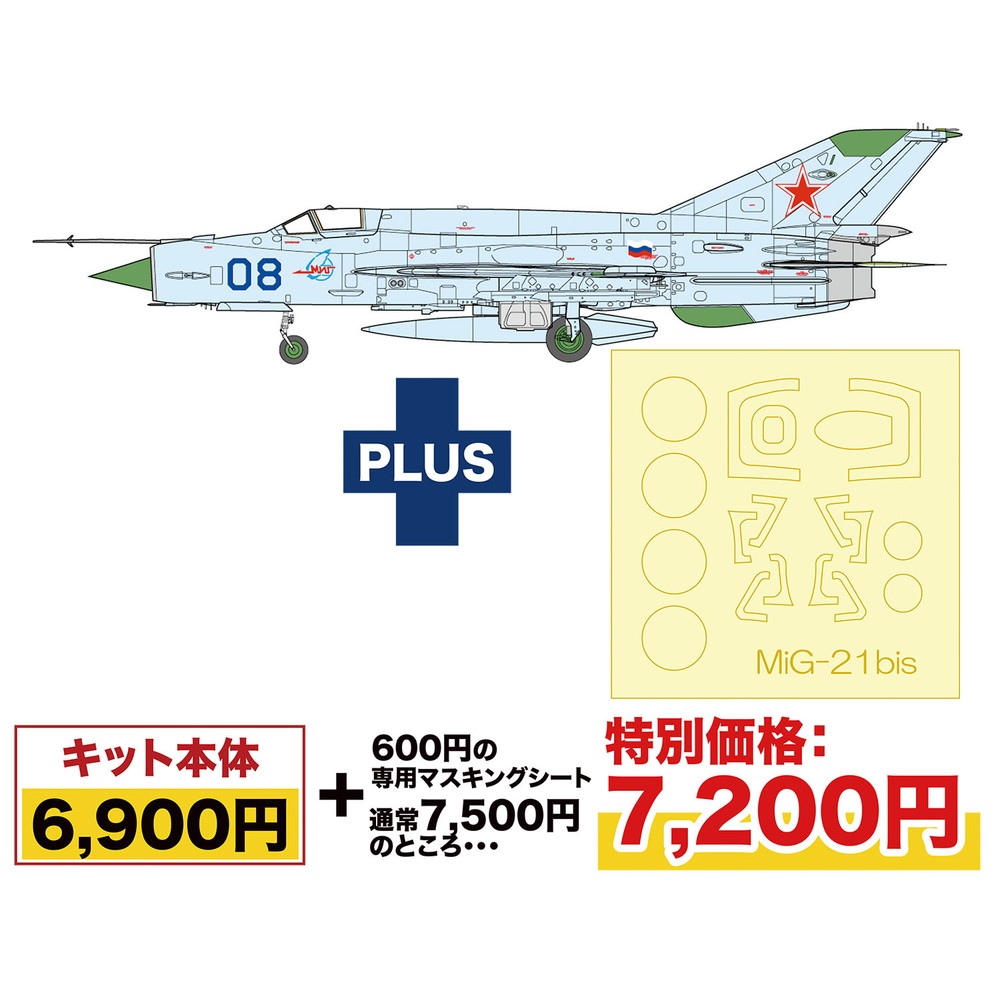 デルタ翼で機首にエアインテークを配置したMiG-21フィッシュベッドならではの機影を正確に再現しています。加えてこのキットではキャノピーのフレームやタイヤの塗装に便利なマスキングシールをセット。
