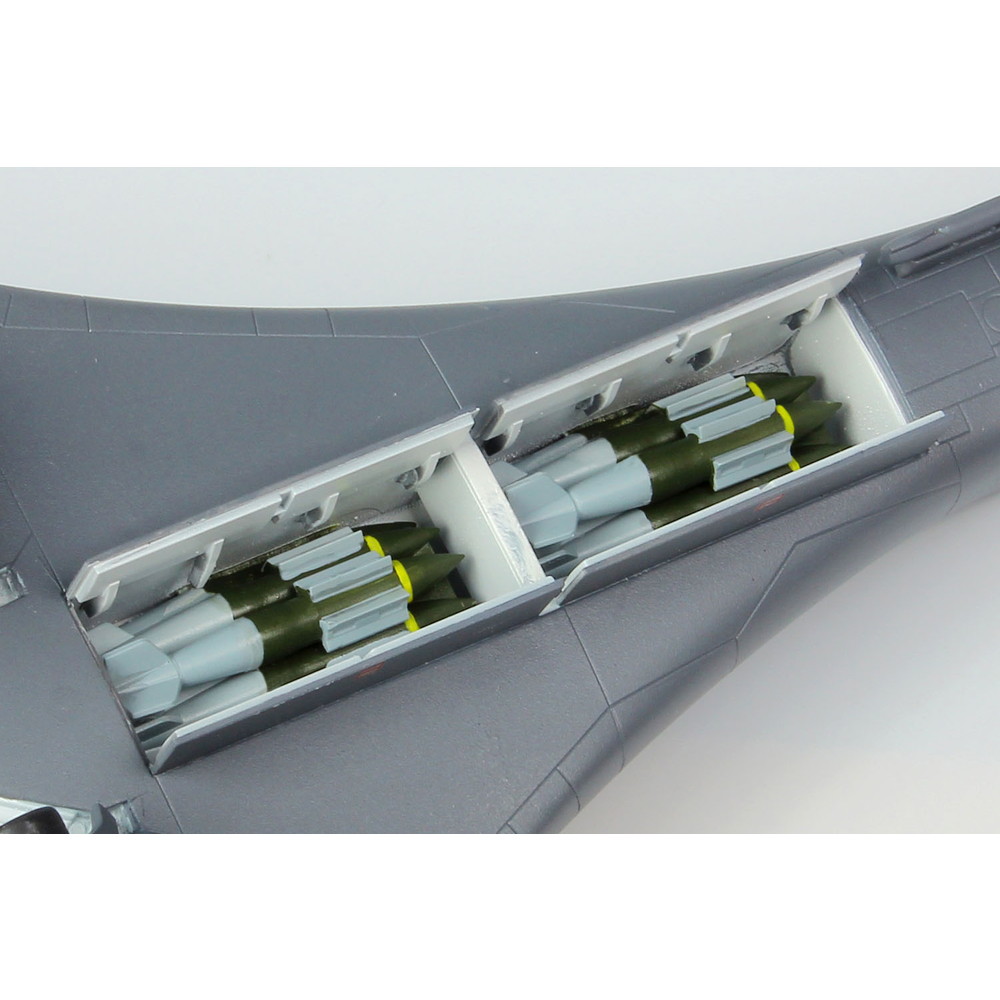 B-1Bランサーの特徴である可変翼は完成後も左右連動して動かせます。また、開閉を選択して組み立てられる爆弾倉にはGBU-31JDAM爆弾も再現。 爆弾倉に満載された爆弾が戦略爆撃機の威力を伝えます。もちろん、脚やエンジンポッド、さらに、コクピットへのクルーの 昇降用ラダーパーツなど、繊細な再現が仕上がりのリアリティをアップ。AN/AAQ-33スナイパー照準ポッドもしっかりとモデル化しています。