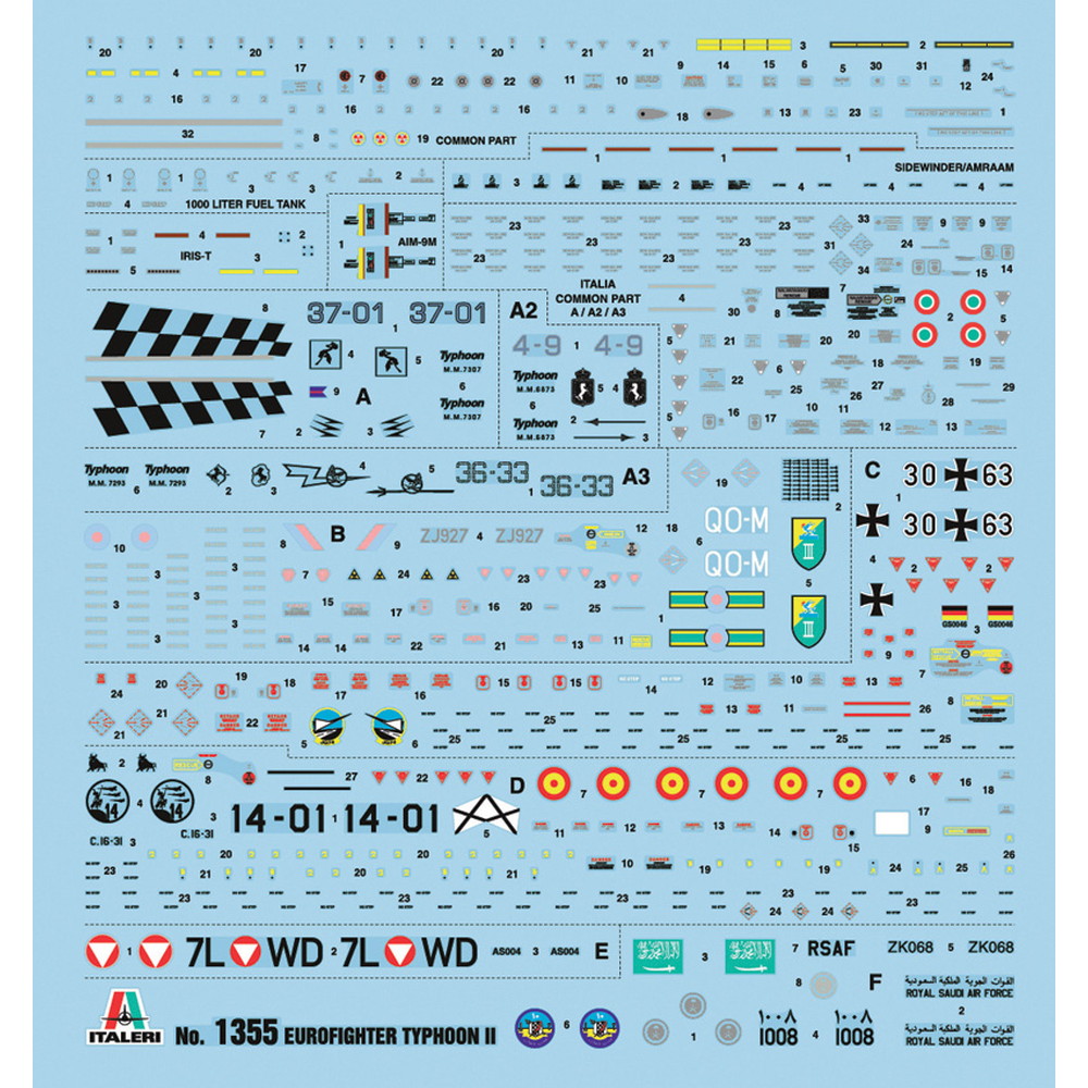 タイフーンを運用するイギリス、イタリア、スペイン、ドイツのほかオーストリア、リビア、サウジアラビアなど7カ国から計8種の機体のマーキングを収録したデカールを用意しています。
