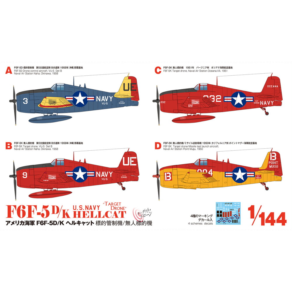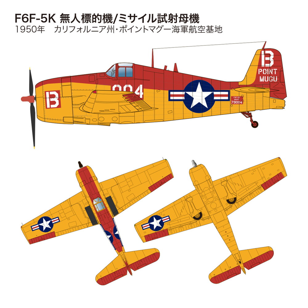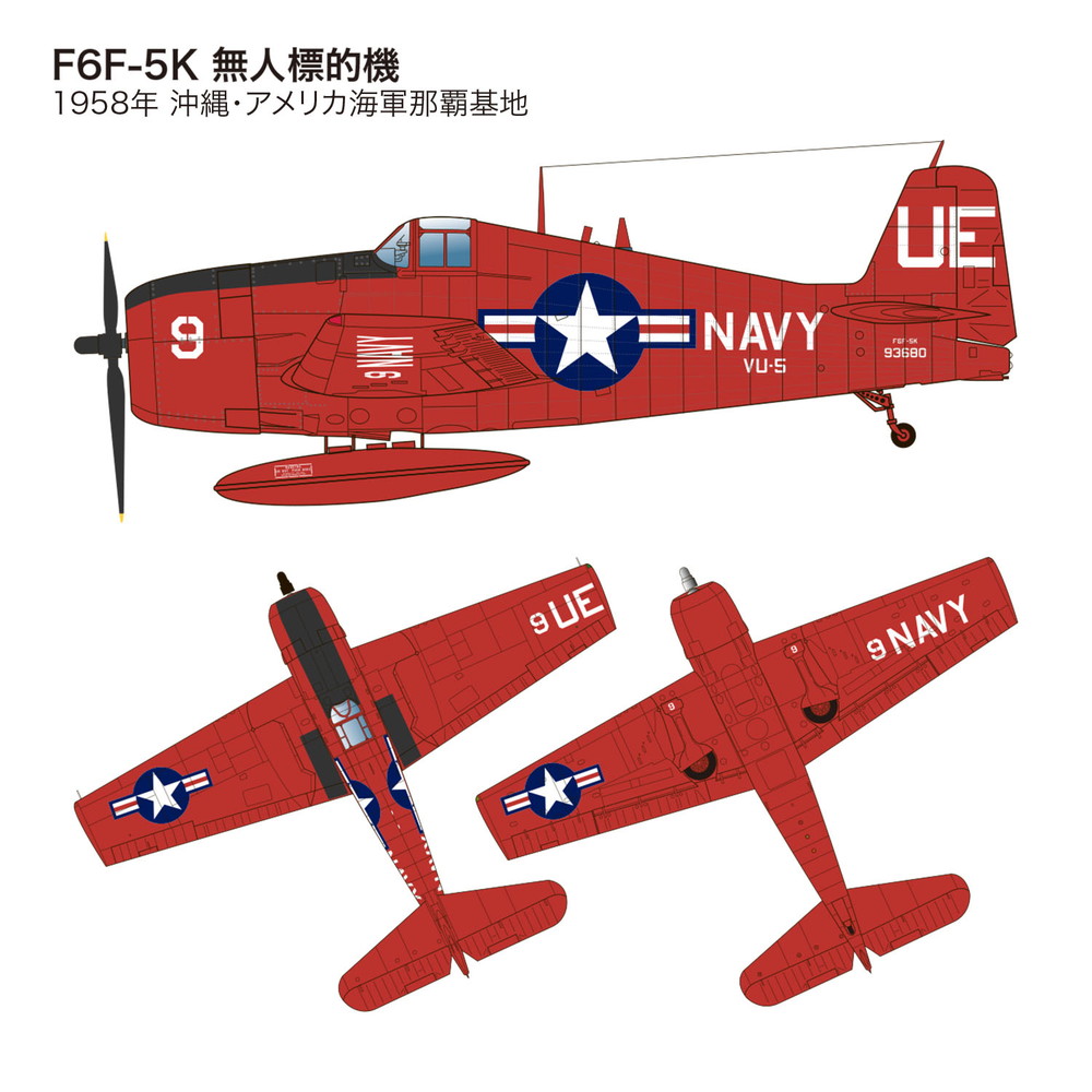 キットは後期生産型にあたるF6F-5ベースの無人機をセレクトし、無線操縦による無人標的機や、その無人機に随伴してコントロールする標的管制機など、4種のマーキングを収録。機体全面をレッドとした無人標的機や、そこにさらにオレンジの警戒色を加えたミサイル試射母機など、軍用機中心の製作ではあまり使わないカラフルな機体色を使っての塗装作業も楽しみ。戦後のジェット機世代への橋渡し役として重要な任務に就いた機体だけに、独特の存在感を味わっていただけるキットです。