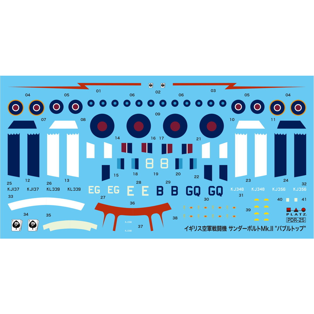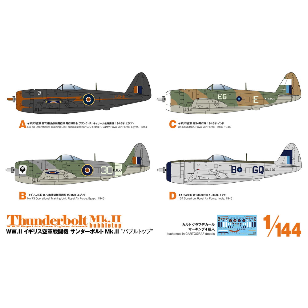 キットは水滴型の風防を装備したʼバブルトップʼ型のサンダーボルトMk.IIの2機セット。マーキングはビルマ戦線 で戦った機体2種と、熱帯地域での戦闘を見越して北アフリカで訓練にあたった機体2種をセレクト。しかも これら4種のマーキングは全て異なるスタイルの機体塗装となっているのも魅力です。英空軍戦闘機の標準的 なグレイ迷彩、ビルマ戦線の苛酷さも伝わるブラウン系迷彩、米軍機的な無塗装シルバー、そして訓練部隊指揮 官機の凄みのある専用塗装と選択が楽しみなマーキングです。