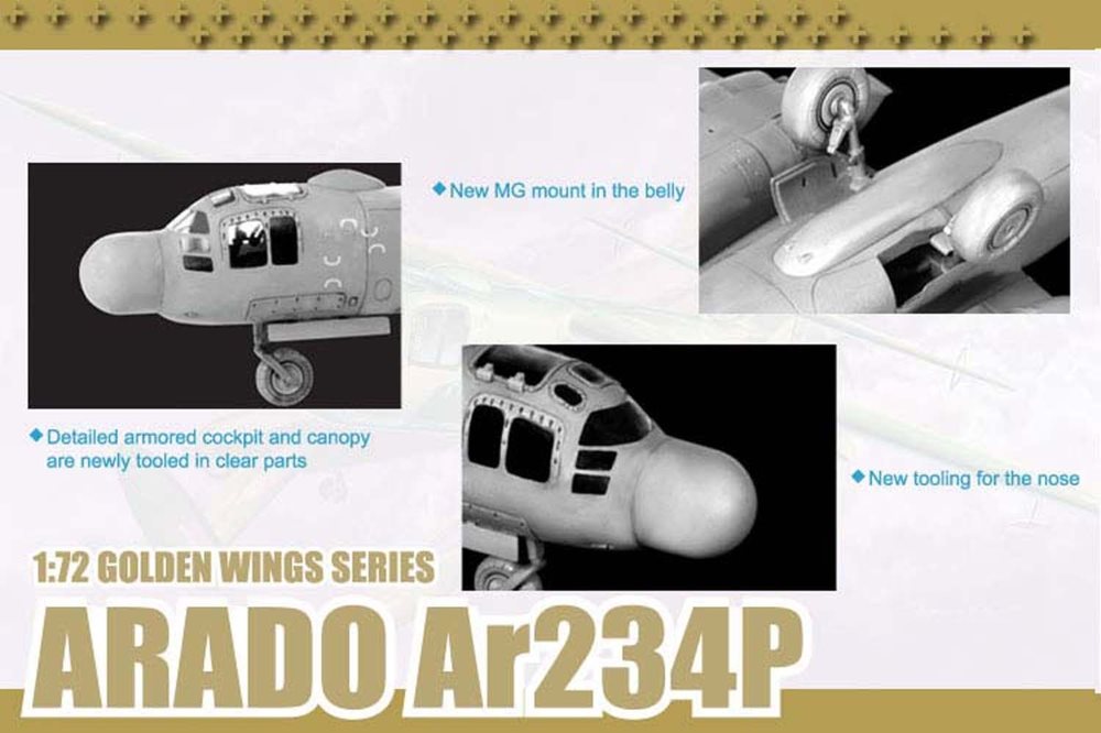 モデルは第二次大戦末期にドイツが計画した夜間ジェット戦闘機、アラドAr234Pを再現した1/72スケールのプラスチックモデル組み立てキットです。特徴ある機首形状を持つコクピット部分は専用パーツで再現しています。