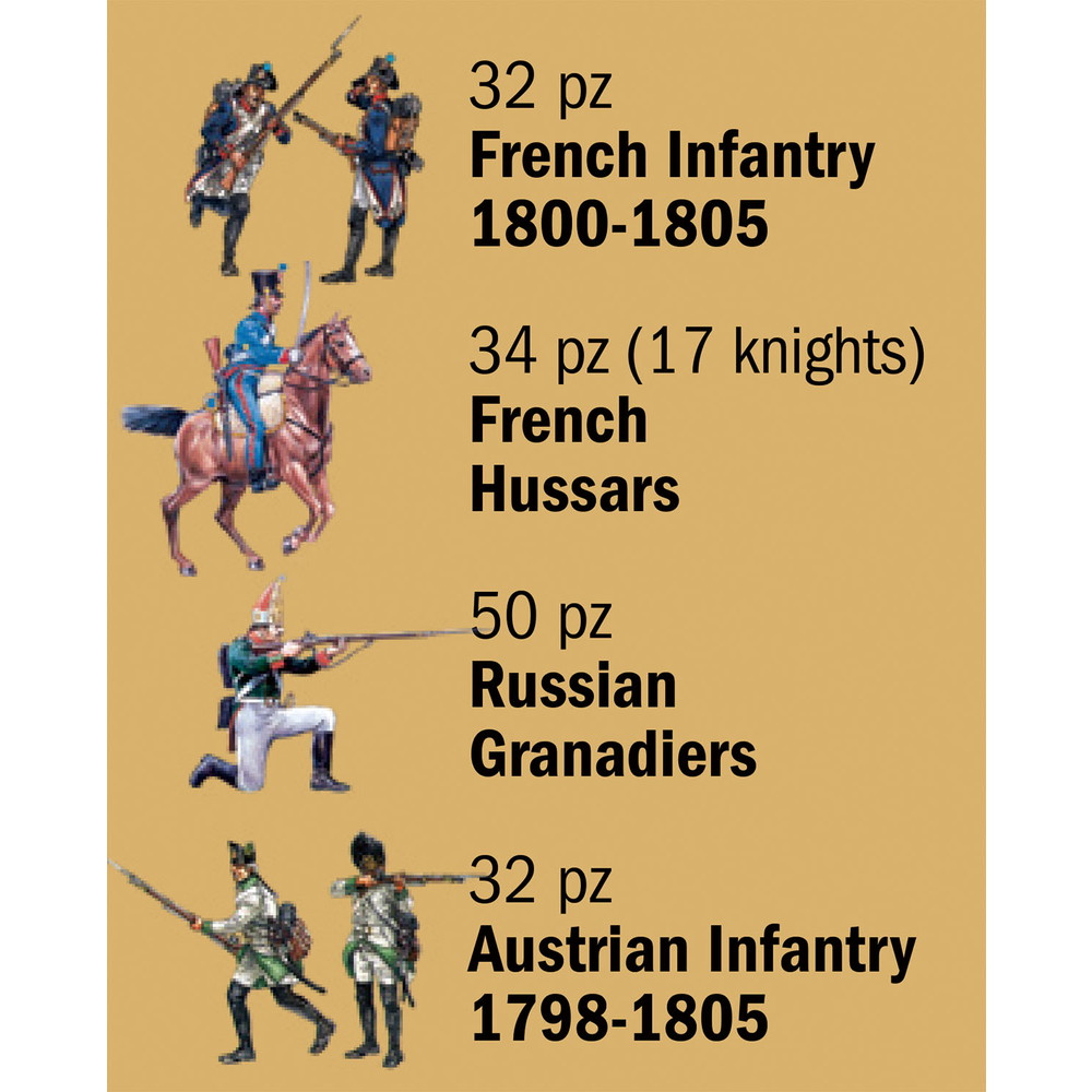 そして、その建物を巡り攻防を繰り広げたナポレオン率いるフランス軍歩兵と騎馬軽騎兵のフィギュアが49体とロシア軍擲弾兵32体、そしてオーストリア歩兵50体のフィギュアをセット。