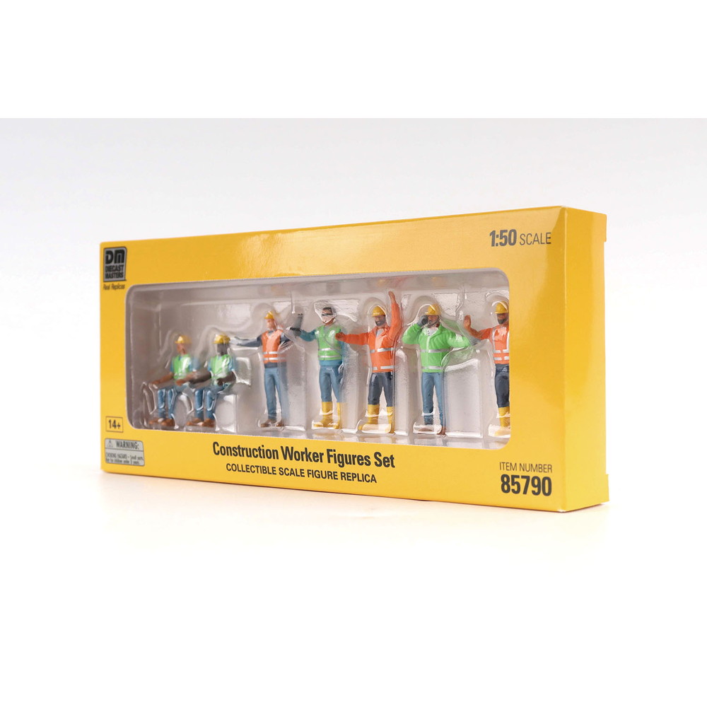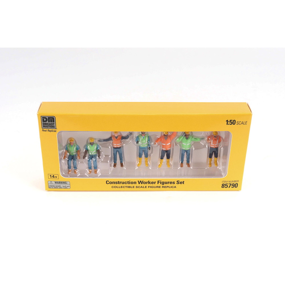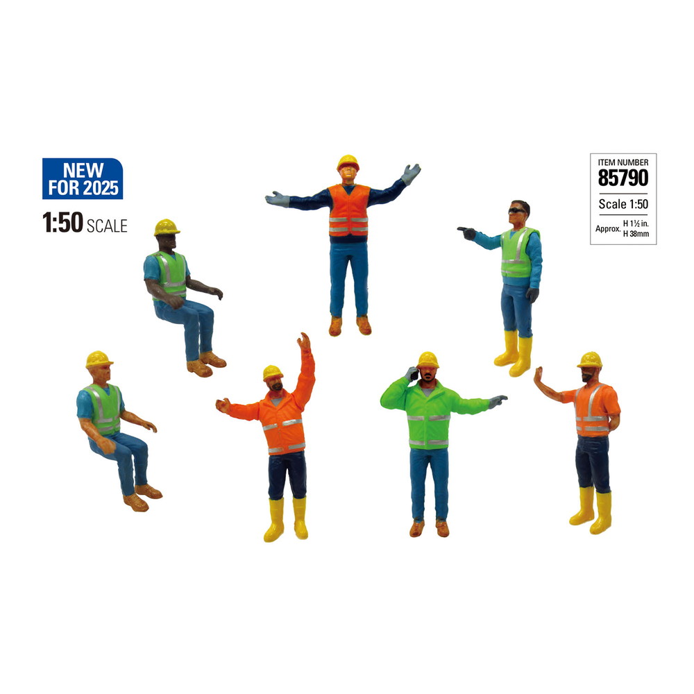 ダイキャストマスターの各種1/50スケールの建機モデルとあわせて展示を楽しめる工事現場の作業員を再現した1/50スケールフィギュアモデル7体の完成品です。