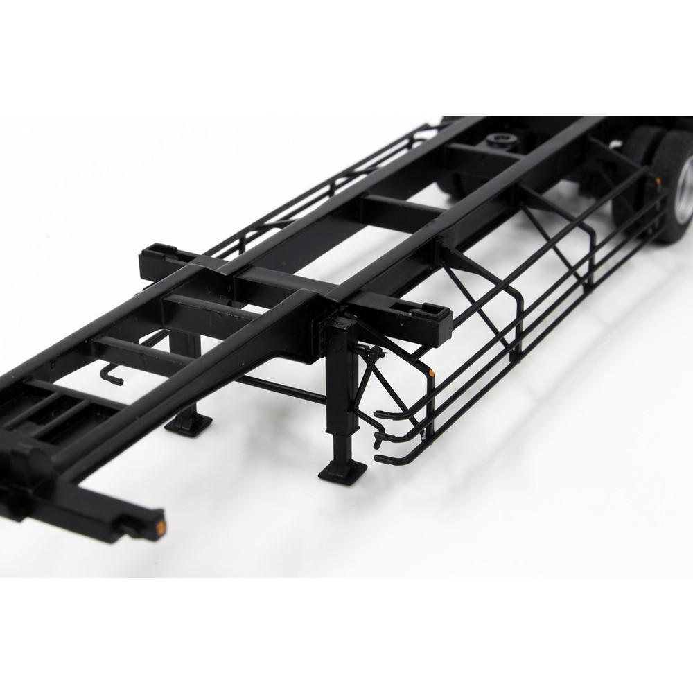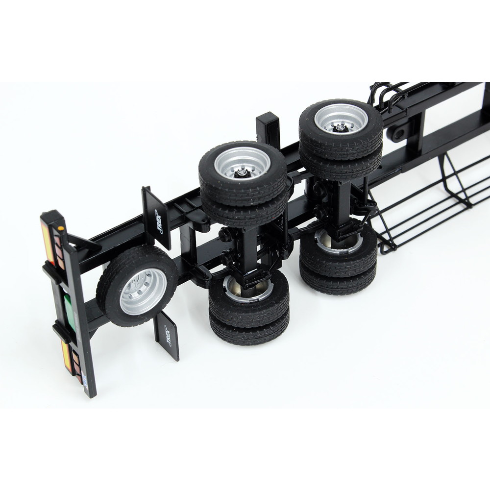 このモデルは今や世界の物流の基本となっている海上コンテナを陸上で輸送するための専用のトレーラ(黒色)を1/50スケールで再現しています。