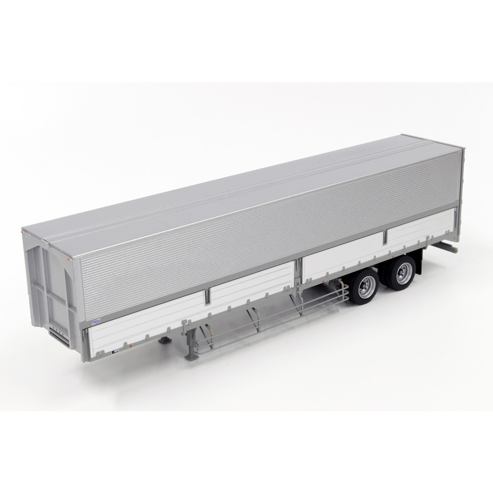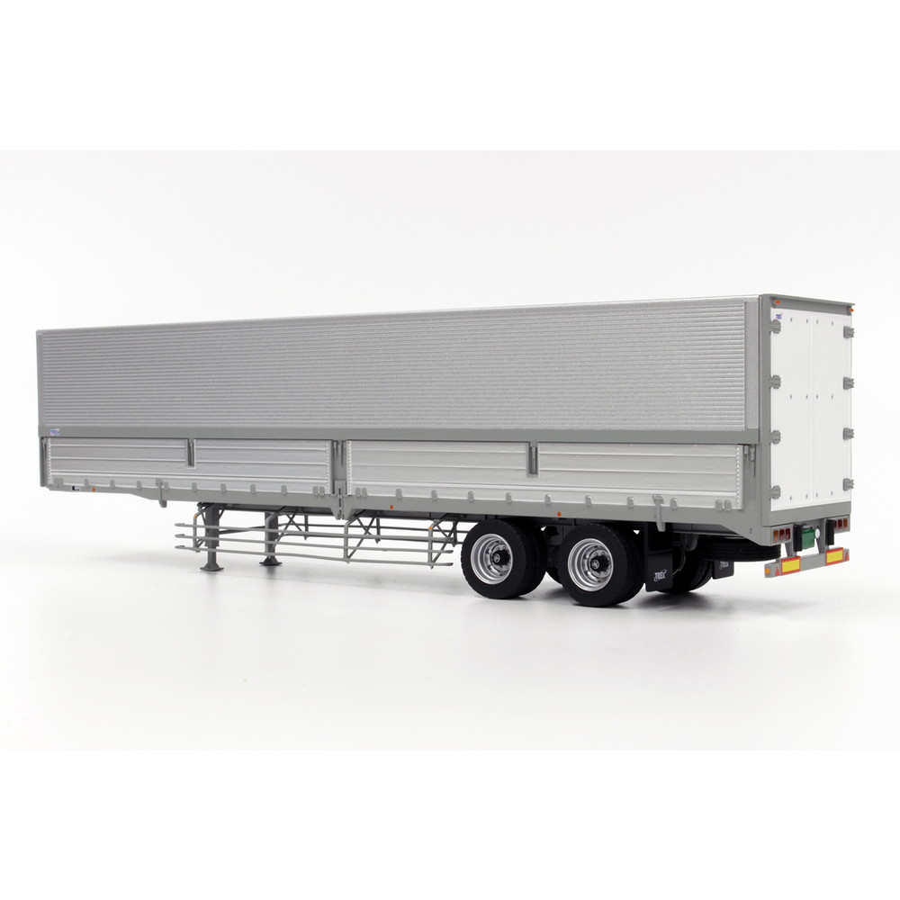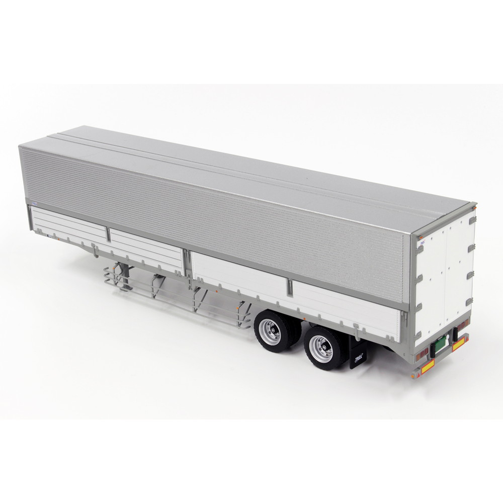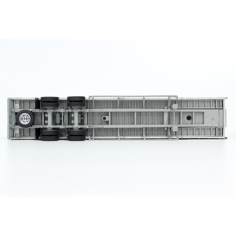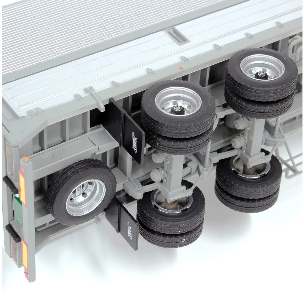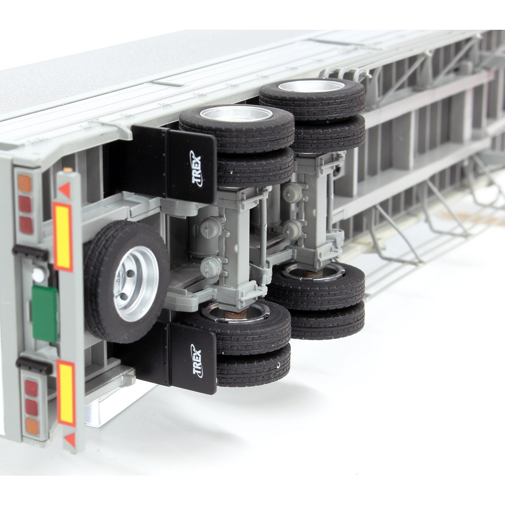 トラクタと組み合わせたときは収納した状態で、トレーラ単体で飾るときは伸ばした状態でディスプレイできます。 このモデルでは全体をシルバーで。タイヤのマッドフラップやボディにTREX社のロゴマークも再現しています。