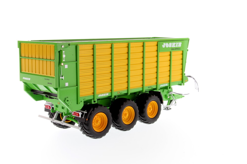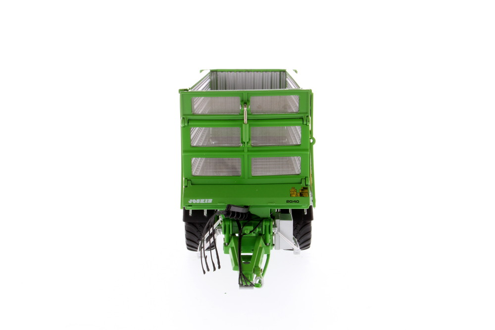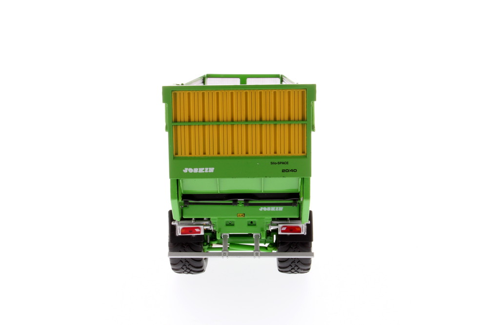 モデルはベルギーのヨスキン社製貨物カーゴ、サイロスペースを1/32スケールのビッグスケールで再現した塗装組み立て済み完成ミニカーモデルです。全長は約25cm、高さ約11cm。オープントップのカーゴは前後左右の壁面やフロアのフレームも細かく再現。くわえてカーゴを搭載する三軸の車輪がついたラダーフレームもその形状やアクスル部分のメカニズムをしっかりとモデル化しています。フレームとカーゴは実車同様に取り外してディスプレイすることも可能です。また、リヤとサイドの小さなドアは開閉が楽しめます。フレームは牽引するトラクターとの連結部分などもメカニカルに再現。各種揃っているトラクターモデルと組み合わせてお楽しみいただけます。車体などはグリーンで塗装され、ヨスキン社のロゴマークも再現済み。働く車の魅力にあふれた1台です。