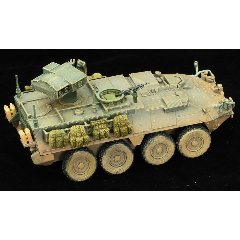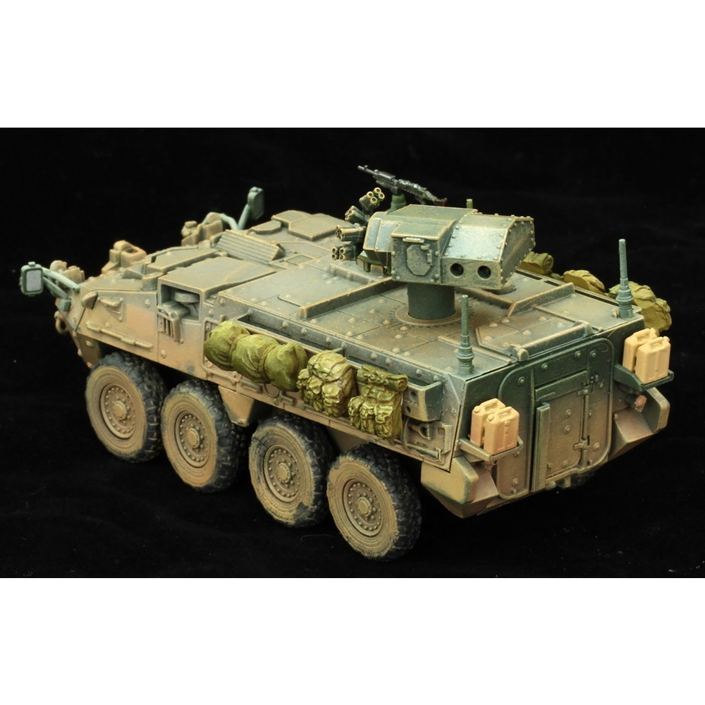 このモデルでは2020年シリアに展開して活動しているストライカー旅団の車両を再現。マーキングはもちろん、特徴ある土埃の色合いなどをしっかりと表現。加えて車体に搭載されたバッグなどの装備品もリアリティを高めています。