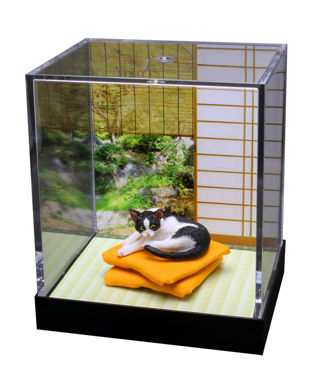 1/12スケールのドールハウスサイズのフィギュアを透明のケースに入れた【ネコのいる空間】を再現。