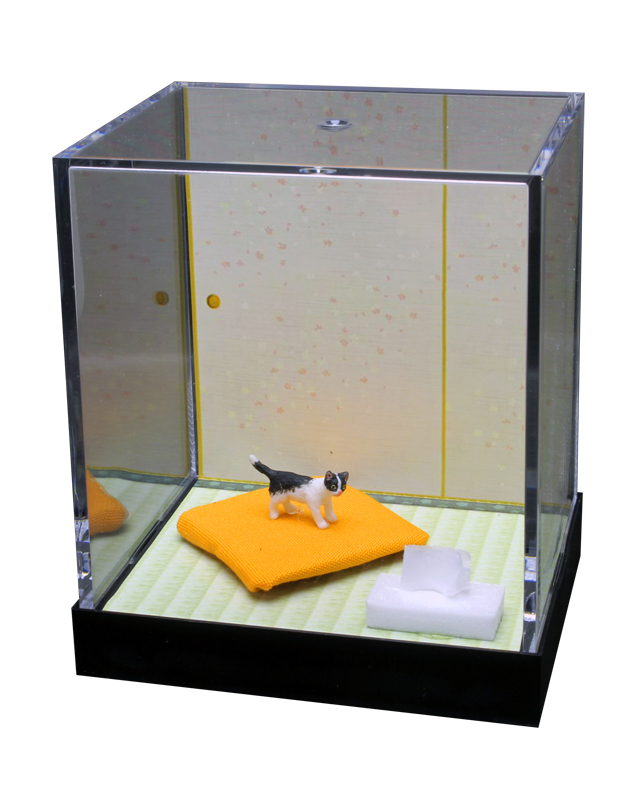 1/12スケールのドールハウスサイズのフィギュアを透明のケースに入れた【ネコのいる空間】を再現。