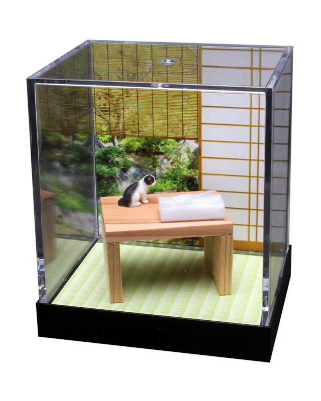 1/12スケールのドールハウスサイズのフィギュアを透明のケースに入れた【ネコのいる空間】を再現。