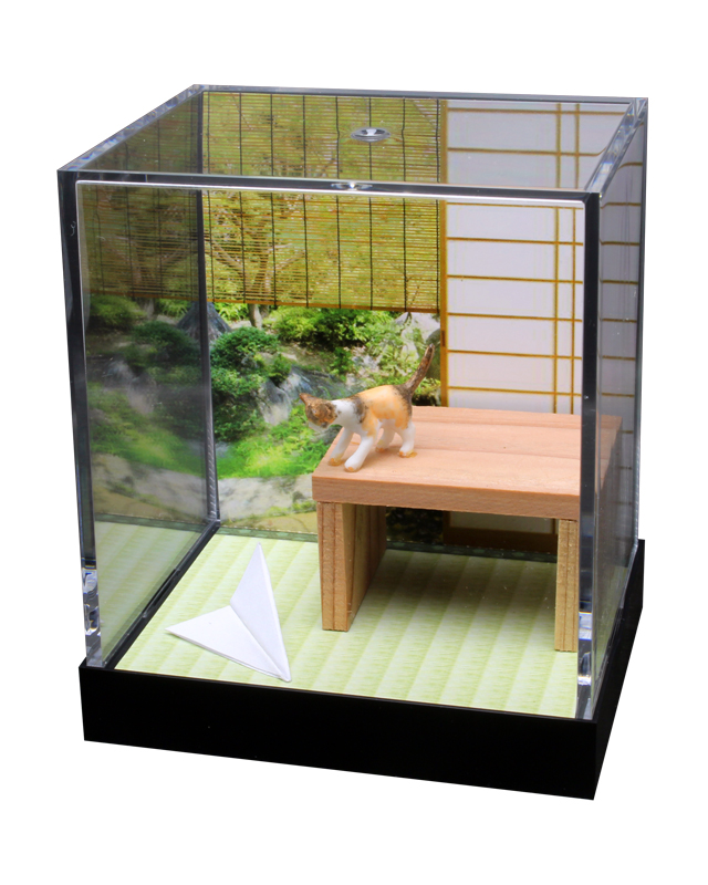 1/12スケールのドールハウスサイズのフィギュアを透明のケースに入れた【ネコのいる空間】を再現。
