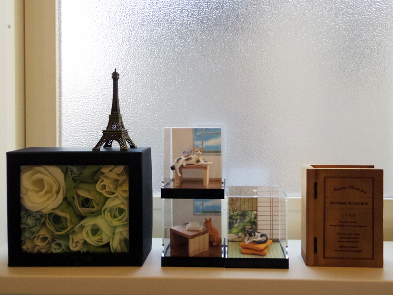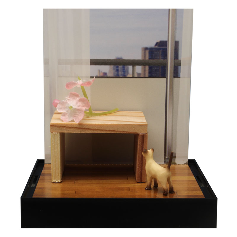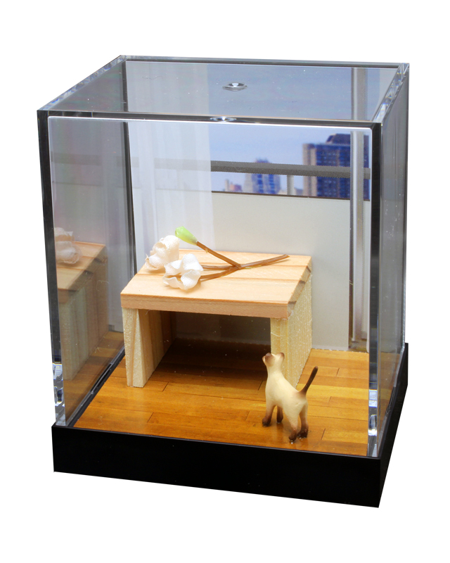 1/12スケールのドールハウスサイズのフィギュアを透明のケースに入れた【ネコのいる空間】を再現。