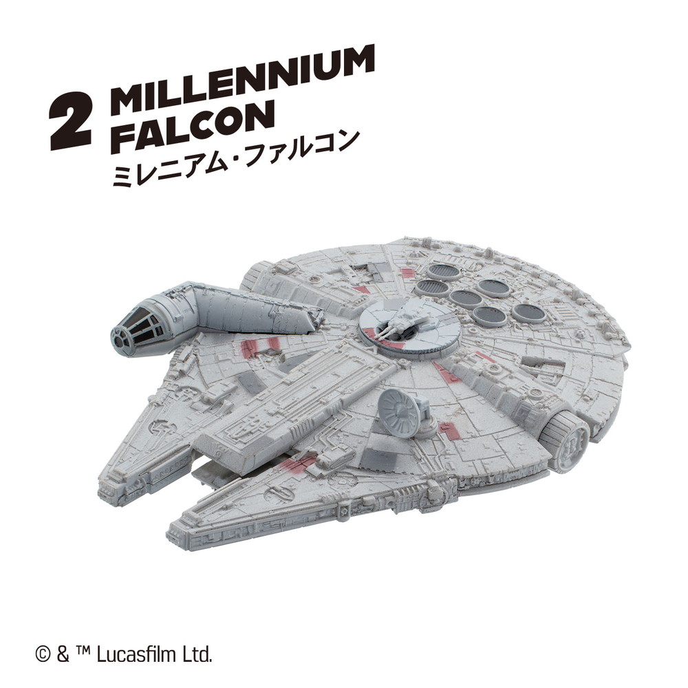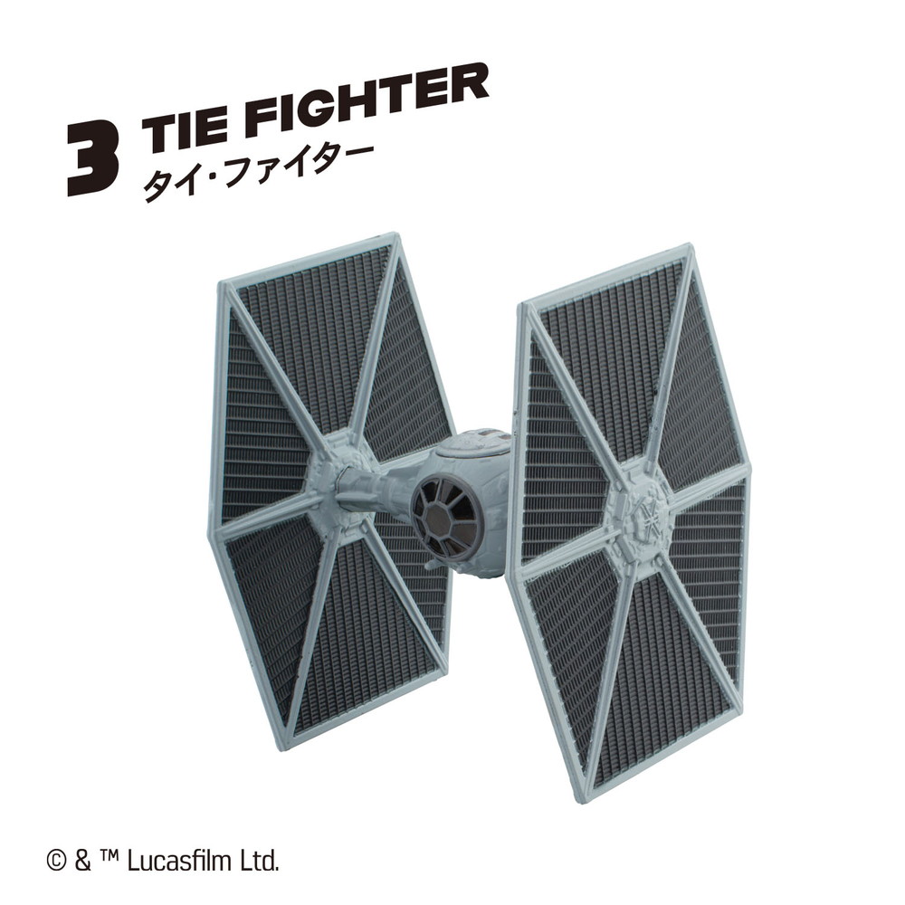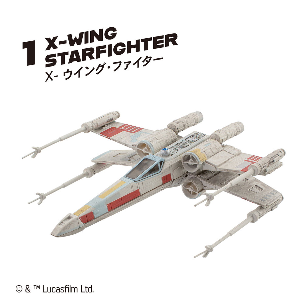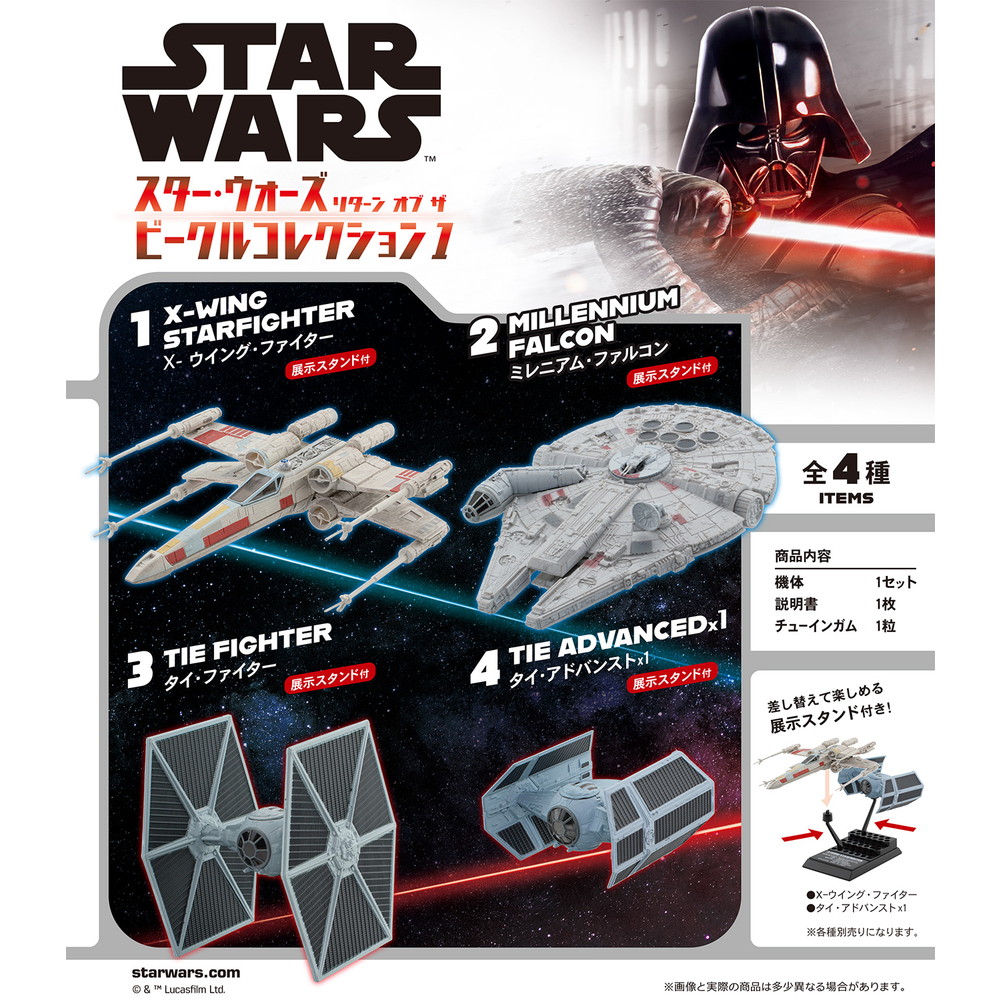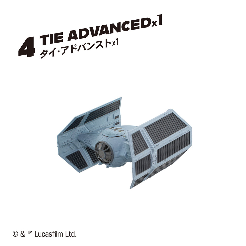 エピソードIVで登場したミレニアム・ファルコン、Xウイング・ファイター、タイ・ファイター、そしてダース・ベイダーが搭乗したタイ・アドバンストの4機をモデル化。