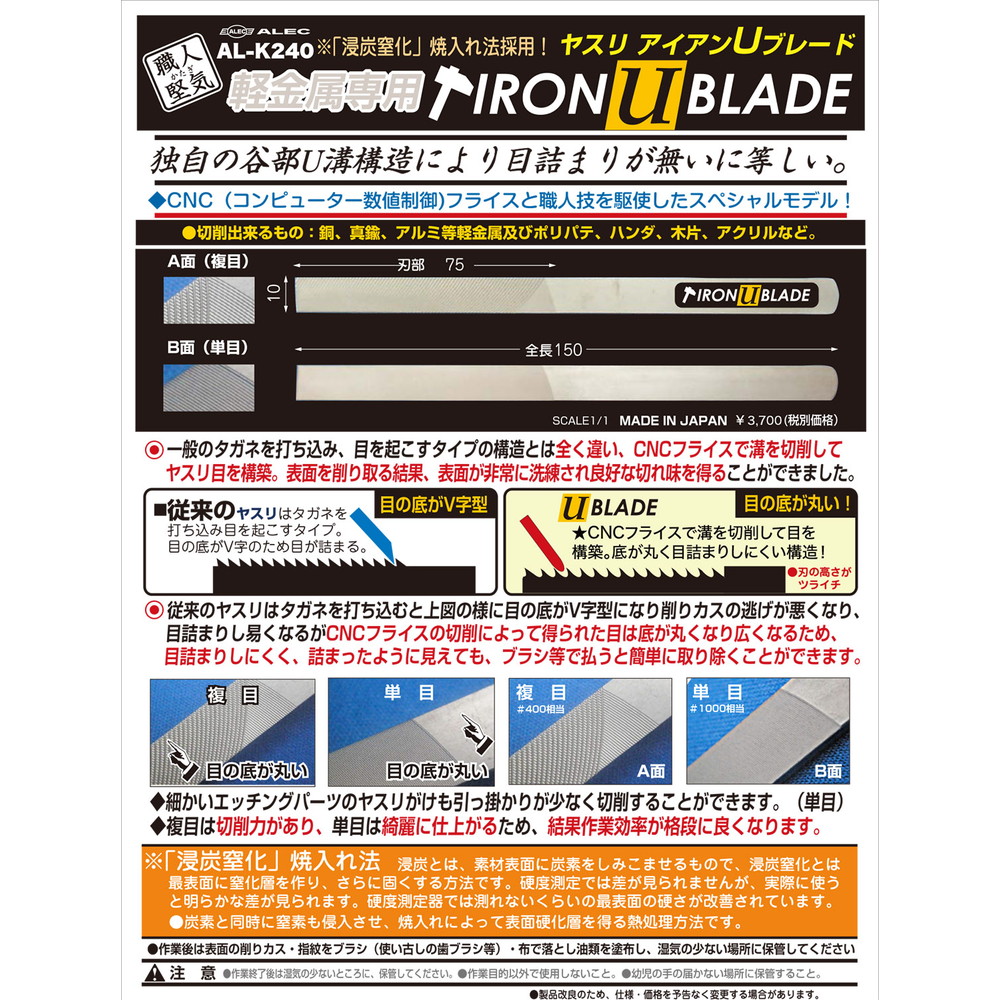 ※職人堅気 軽金属専用ヤスリ アイアンUブレード(AL-K240)の発売に合わせ、職人堅気 軽金属専用ヤスリ アイアンUブレード(AL-K63)は廃盤となります。