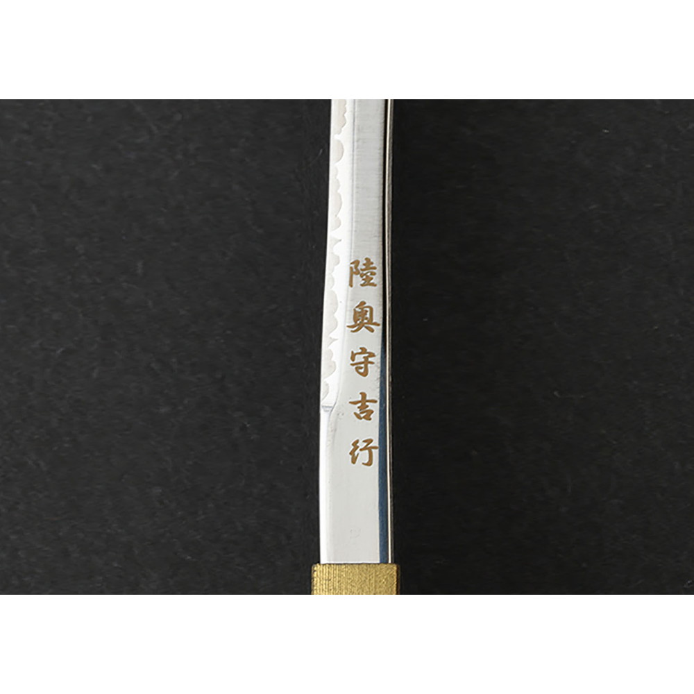 ●坂本龍馬の愛刀をモチーフとしており、刃体には愛刀の名称”陸奥守吉行”が入り、刃紋は互の目形状となっております。